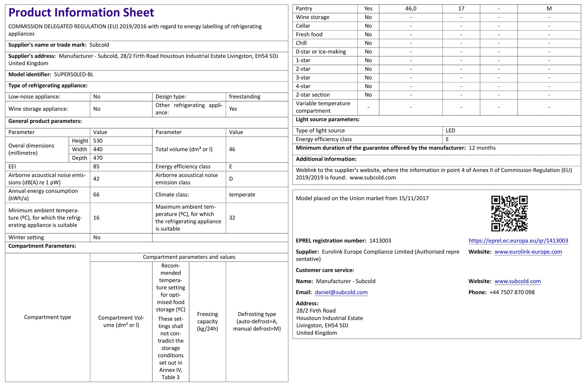 The Subcold Super range mini fridges are made from premium quality materials and equipped with advanced compressor cooling technology for optimum performance. They are economical and peaceful with a noise level of only 42dB and an energy consumption of only 66kWh/annum. The temperature range is 3°C to 18°C (+/- 2°C), adjustable with an easy to use thermostat.